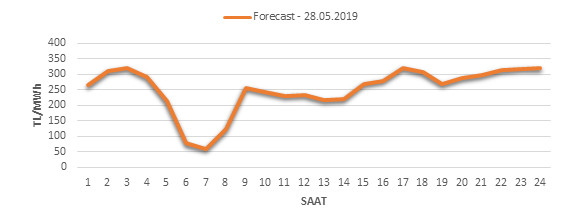 Yarından sonraki gün için oluşacak ortalama piyasa takas fiyatı 250.61 TL/MWH olarak tahmin edilmektedir. Buna bağlı olarak günün maksimum fiyatı 319.21 TL/MWh olarak 16:00 – 17:00 saat aralığında, minimum fiyatı 60.47 TL/MWh olarak 06:00 – 07:00 saat aralığında gerçekleşeceği öngörülmektedir. Puant saatlerde (17:00 – 22:00) tahmini ortalama piyasa takas fiyatı ise 297.28 TL/MWh olarak hesaplanabilmektedir. Saatlik oluşacak piyasa takas fiyatı tahminleri aşağıdaki grafikte yer almaktadır.
