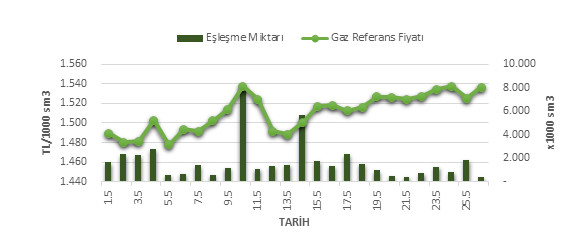 Organize Toptan Doğal Gaz Satış Piyasası (OTSP) dahilinde 01.05.2019 – 26.05.2019 tarihleri arası ortalama Gaz Referans Fiyatı (GRF) 1,510.38 TL/1000 sm3 olarak belirlenirken, aynı tarihler arasında toplam gerçekleşen eşleşmelerin miktarı ise 44,695 x1000 sm3 olarak belirlendi. İlgili tarihler arasında günlük Gaz Referans Fiyatı (GRF) ile Eşleşme Miktarı verileri aşağıdaki grafikte yer almaktadır.