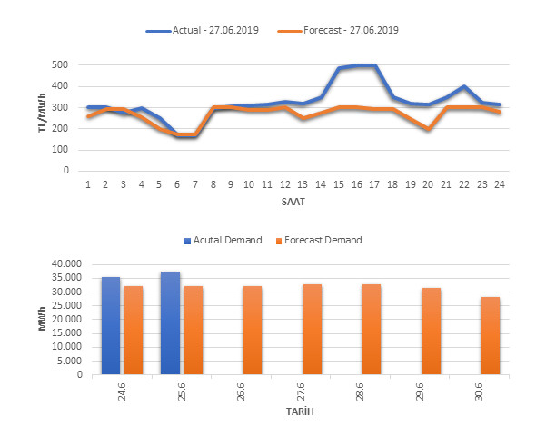 Tahminleme Modeli* analizi sonucu ortalama piyasa takas fiyatı 269.48 TL/MWh ve ortalama tüketim 32,865 MWh olarak öngörülmektedir. Modelin piyasa takas fiyatına dair başarı oranı günlük % 74, tüketime dair başarı oranı** ise günlük % 86 olarak hesaplanırken, bugüne kadar yapılan piyasa takas fiyatına dair analizlere göre başarı oranı % 91, tüketime dair başarı oranı ise % 95 olarak hesaplanmaktadır. Saatlik yarın için oluşan ve tahmin edilen piyasa takas fiyatları ile haftalık bazda tahmin edilen ve gerçekleştikçe yer alacak günlük ortalama tüketim değerleri aşağıdaki grafiklerde yer almaktadır.