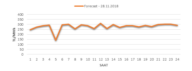Yarından sonraki gün için oluşacak ortalama piyasa takas fiyatı 278.33 TL/MWH olarak tahmin edilmektedir. Buna bağlı olarak günün maksimum fiyatı 310.46 TL/MWh olarak 11:0012:00 saat aralığında, minimum fiyatı 141.23 TL/MWh olarak 04:0005:00 saat aralığında gerçekleşeceği öngörülmektedir. Puant saatlerde (17:0022:00) tahmini ortalama piyasa takas fiyatı ise 290.62 TL/MWh olarak hesaplanabilmektedir. Saatlik oluşacak piyasa takas fiyatı tahminleri aşağıdaki grafikte yer almaktadır.