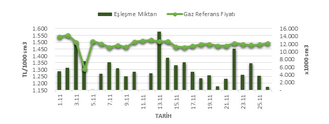 Organize Toptan Doğal Gaz Satış Piyasası (OTSP) dahilinde 01.10.201826.11.2018 tarihleri arası ortalama Gaz Referans Fiyatı (GRF) 1,483.45 TL/1000 sm3 olarak belirlenirken, aynı tarihler arasında toplam gerçekleşen eşleşmelerin miktarı ise 140,400 x1000 sm3 olarak belirlendi. İlgili tarihler arasında günlük Gaz Referans Fiyatı (GRF) ile Eşleşme Miktarı verileri aşağıdaki grafikte yer almaktadır.