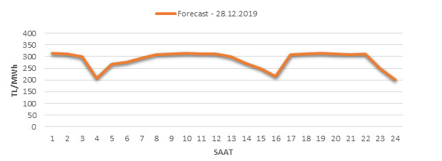 Yarından sonraki gün için oluşacak ortalama piyasa takas fiyatı 287.84 TL/MWH olarak tahmin edilmektedir. Buna bağlı olarak günün maksimum fiyatı 316 TL/MWh olarak 18:0019:00 saat aralığında, minimum fiyatı 200 TL/MWh olarak 23:00 – Avg.:00 saat aralığında gerçekleşeceği öngörülmektedir. Puant saatlerde (17:0022:00) tahmini ortalama piyasa takas fiyatı ise 302.86 TL/MWh olarak hesaplanabilmektedir. Saatlik oluşacak piyasa takas fiyatı tahminleri aşağıdaki grafikte yer almaktadır.
