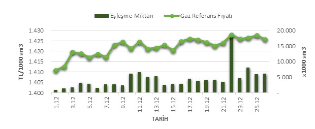 Organize Toptan Doğal Gaz Satış Piyasası (OTSP) dahilinde 01.12.201926.12.2019 tarihleri arası ortalama Gaz Referans Fiyatı (GRF) 1,422.08 TL/1000 sm3 olarak belirlenirken, aynı tarihler arasında toplam gerçekleşen eşleşmelerin miktarı ise 113,641 x1000 sm3 olarak belirlendi. İlgili tarihler arasında günlük Gaz Referans Fiyatı (GRF) ile Eşleşme Miktarı verileri aşağıdaki grafikte yer almaktadır.
