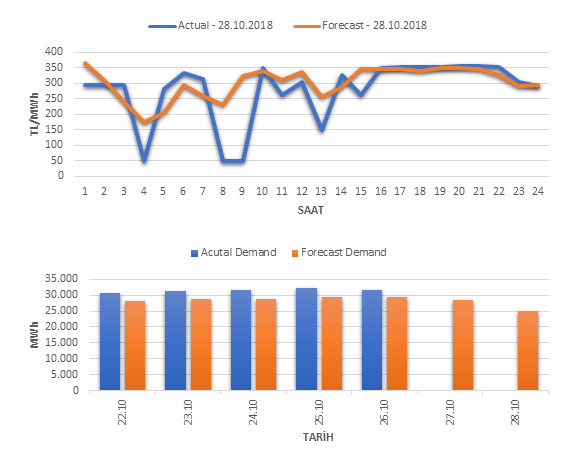 Tahminleme Modeli* analizi sonucu ortalama piyasa takas fiyatı 303,80 TL/MWh ve ortalama tüketim 25.140 MWh olarak öngörülmektedir. Modelin piyasa takas fiyatına dair başarı oranı günlük % 73, tüketime dair başarı oranı** ise günlük % 93 olarak hesaplanırken, bugüne kadar yapılan piyasa takas fiyatına dair analizlere göre başarı oranı % 86, tüketime dair başarı oranı ise % 91 olarak hesaplanmaktadır. Saatlik yarın için oluşan ve tahmin edilen piyasa takas fiyatları ile haftalık bazda tahmin edilen ve gerçekleştikçe yer alacak günlük ortalama tüketim değerleri aşağıdaki grafiklerde yer almaktadır.