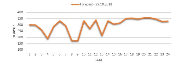 Yarından sonraki gün için oluşacak ortalama piyasa takas fiyatı 299,12 TL/MWH olarak tahmin edilmektedir. Buna bağlı olarak günün maksimum fiyatı 355,91 TL/MWh olarak 20:00 – 21:00 saat aralığında, minimum fiyatı 174,34 TL/MWh olarak 08:00 – 09:00 saat aralığında gerçekleşeceği öngörülmektedir. Puant saatlerde (17:00 – 22:00) tahmini ortalama piyasa takas fiyatı ise 347,24 TL/MWh olarak hesaplanabilmektedir. Saatlik oluşacak piyasa takas fiyatı tahminleri aşağıdaki grafikte yer almaktadır.