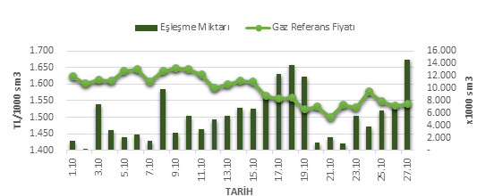 Organize Toptan Doğal Gaz Satış Piyasası (OTSP) dahilinde 01.10.2018 – 27.10.2018 tarihleri arası ortalama Gaz Referans Fiyatı (GRF) 1.585,67 TL/1000 sm3 olarak belirlenirken, aynı tarihler arasında toplam gerçekleşen eşleşmelerin miktarı ise 151.180 x1000 sm3 olarak belirlendi. İlgili tarihler arasında günlük Gaz Referans Fiyatı (GRF) ile Eşleşme Miktarı verileri aşağıdaki grafikte yer almaktadır.