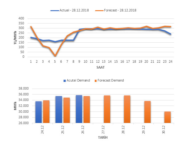 Tahminleme Modeli* analizi sonucu ortalama piyasa takas fiyatı 257.13 TL/MWh ve ortalama tüketim 35,685 MWh olarak öngörülmektedir. Modelin piyasa takas fiyatına dair başarı oranı günlük % 61, tüketime dair başarı oranı** ise günlük % 99 olarak hesaplanırken, bugüne kadar yapılan piyasa takas fiyatına dair analizlere göre başarı oranı % 88, tüketime dair başarı oranı ise % 94 olarak hesaplanmaktadır. Saatlik yarın için oluşan ve tahmin edilen piyasa takas fiyatları ile haftalık bazda tahmin edilen ve gerçekleştikçe yer alacak günlük ortalama tüketim değerleri aşağıdaki grafiklerde yer almaktadır.