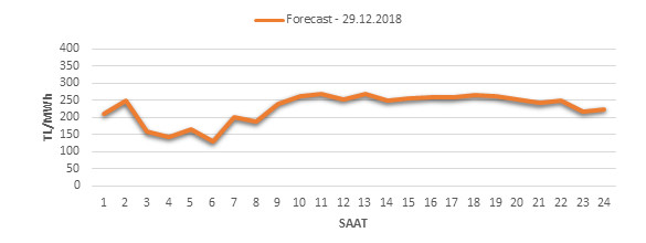 Yarından sonraki gün için oluşacak ortalama piyasa takas fiyatı 226.81 TL/MWH olarak tahmin edilmektedir. Buna bağlı olarak günün maksimum fiyatı 267.41 TL/MWh olarak 10:00 – 11:00 saat aralığında, minimum fiyatı 128.95 TL/MWh olarak 05:00 – 06:00 saat aralığında gerçekleşeceği öngörülmektedir. Puant saatlerde (17:00 – 22:00) tahmini ortalama piyasa takas fiyatı ise 246.6 TL/MWh olarak hesaplanabilmektedir. Saatlik oluşacak piyasa takas fiyatı tahminleri aşağıdaki grafikte yer almaktadır.