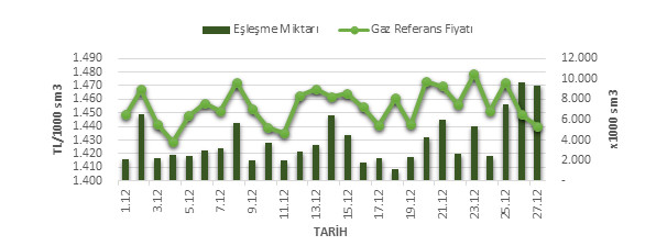 Organize Toptan Doğal Gaz Satış Piyasası (OTSP) dahilinde 01.12.2018 – 27.12.2018 tarihleri arası ortalama Gaz Referans Fiyatı (GRF) 1,454.81 TL/1000 sm3 olarak belirlenirken, aynı tarihler arasında toplam gerçekleşen eşleşmelerin miktarı ise 106,968 x1000 sm3 olarak belirlendi. İlgili tarihler arasında günlük Gaz Referans Fiyatı (GRF) ile Eşleşme Miktarı verileri aşağıdaki grafikte yer almaktadır.
