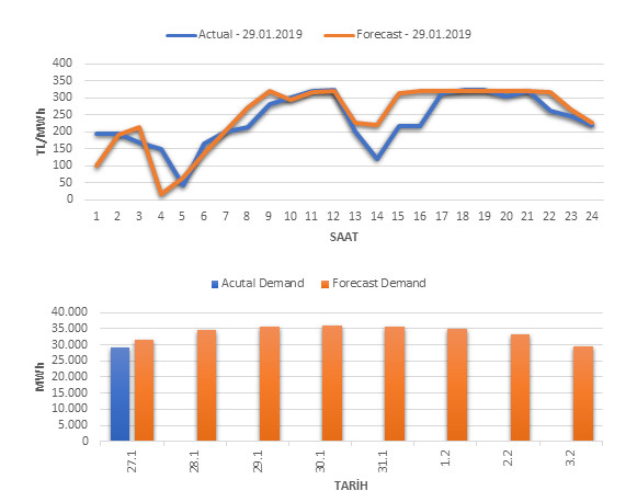 Tahminleme Modeli* analizi sonucu ortalama piyasa takas fiyatı 246.39 TL/MWh ve ortalama tüketim 35,802 MWh olarak öngörülmektedir. Modelin piyasa takas fiyatına dair başarı oranı günlük % 81, tüketime dair başarı oranı** ise günlük % 92 olarak hesaplanırken, bugüne kadar yapılan piyasa takas fiyatına dair analizlere göre başarı oranı % 88, tüketime dair başarı oranı ise % 94 olarak hesaplanmaktadır. Saatlik yarın için oluşan ve tahmin edilen piyasa takas fiyatları ile haftalık bazda tahmin edilen ve gerçekleştikçe yer alacak günlük ortalama tüketim değerleri aşağıdaki grafiklerde yer almaktadır.