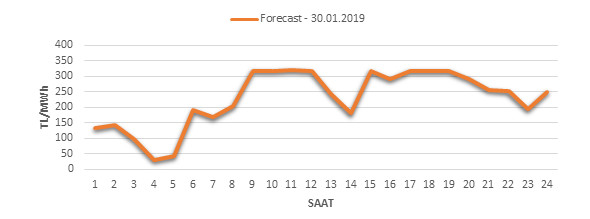 Yarından sonraki gün için oluşacak ortalama piyasa takas fiyatı 229.52 TL/MWH olarak tahmin edilmektedir. Buna bağlı olarak günün maksimum fiyatı 319.92 TL/MWh olarak 10:00 – 11:00 saat aralığında, minimum fiyatı 31.84 TL/MWh olarak 03:00 – 04:00 saat aralığında gerçekleşeceği öngörülmektedir. Puant saatlerde (17:00 – 22:00) tahmini ortalama piyasa takas fiyatı ise 271.46 TL/MWh olarak hesaplanabilmektedir. Saatlik oluşacak piyasa takas fiyatı tahminleri aşağıdaki grafikte yer almaktadır.