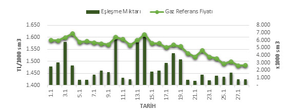 Organize Toptan Doğal Gaz Satış Piyasası (OTSP) dahilinde 01.12.2018 – 28.01.2019 tarihleri arası ortalama Gaz Referans Fiyatı (GRF) 1,558.68 TL/1000 sm3 olarak belirlenirken, aynı tarihler arasında toplam gerçekleşen eşleşmelerin miktarı ise 65,058 x1000 sm3 olarak belirlendi. İlgili tarihler arasında günlük Gaz Referans Fiyatı (GRF) ile Eşleşme Miktarı verileri aşağıdaki grafikte yer almaktadır.