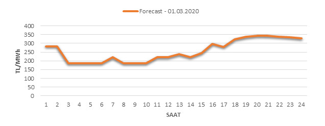 Yarından sonraki gün için oluşacak ortalama piyasa takas fiyatı 256.07 TL/MWH olarak tahmin edilmektedir. Buna bağlı olarak günün maksimum fiyatı 343.36 TL/MWh olarak 19:00 – 20:00 saat aralığında, minimum fiyatı 184.99 TL/MWh olarak 02:00 – 03:00 saat aralığında gerçekleşeceği öngörülmektedir. Puant saatlerde (17:00 – 22:00) tahmini ortalama piyasa takas fiyatı ise 336.27 TL/MWh olarak hesaplanabilmektedir. Saatlik oluşacak piyasa takas fiyatı tahminleri aşağıdaki grafikte yer almaktadır.