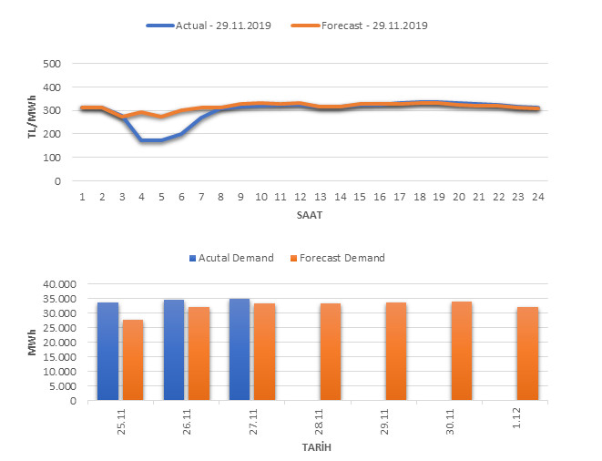 Tahminleme Modeli* analizi sonucu ortalama piyasa takas fiyatı 314.38 TL/MWh ve ortalama tüketim 33,534 MWh olarak öngörülmektedir. Modelin piyasa takas fiyatına dair başarı oranı günlük % 76, tüketime dair başarı oranı** ise günlük % 95 olarak hesaplanırken, bugüne kadar yapılan piyasa takas fiyatına dair analizlere göre başarı oranı % 91, tüketime dair başarı oranı ise % 93 olarak hesaplanmaktadır. Saatlik yarın için oluşan ve tahmin edilen piyasa takas fiyatları ile haftalık bazda tahmin edilen ve gerçekleştikçe yer alacak günlük ortalama tüketim değerleri aşağıdaki grafiklerde yer almaktadır.