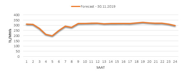 Yarından sonraki gün için oluşacak ortalama piyasa takas fiyatı 301.46 TL/MWH olarak tahmin edilmektedir. Buna bağlı olarak günün maksimum fiyatı 330.1 TL/MWh olarak 18:00 – 19:00 saat aralığında, minimum fiyatı 200.01 TL/MWh olarak 04:00 – 05:00 saat aralığında gerçekleşeceği öngörülmektedir. Puant saatlerde (17:00 – 22:00) tahmini ortalama piyasa takas fiyatı ise 322.26 TL/MWh olarak hesaplanabilmektedir. Saatlik oluşacak piyasa takas fiyatı tahminleri aşağıdaki grafikte yer almaktadır.
