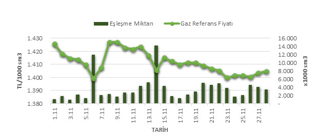 Organize Toptan Doğal Gaz Satış Piyasası (OTSP) dahilinde 01.11.2019 – 28.11.2019 tarihleri arası ortalama Gaz Referans Fiyatı (GRF) 1,411.62 TL/1000 sm3 olarak belirlenirken, aynı tarihler arasında toplam gerçekleşen eşleşmelerin miktarı ise 101,575 x1000 sm3 olarak belirlendi. İlgili tarihler arasında günlük Gaz Referans Fiyatı (GRF) ile Eşleşme Miktarı verileri aşağıdaki grafikte yer almaktadır.
