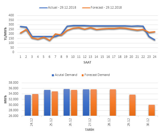 Tahminleme Modeli* analizi sonucu ortalama piyasa takas fiyatı 226.81 TL/MWh ve ortalama tüketim 33663 MWh olarak öngörülmektedir. Modelin piyasa takas fiyatına dair başarı oranı günlük % 75, tüketime dair başarı oranı** ise günlük % 100 olarak hesaplanırken, bugüne kadar yapılan piyasa takas fiyatına dair analizlere göre başarı oranı % 88, tüketime dair başarı oranı ise % 94 olarak hesaplanmaktadır. Saatlik yarın için oluşan ve tahmin edilen piyasa takas fiyatları ile haftalık bazda tahmin edilen ve gerçekleştikçe yer alacak günlük ortalama tüketim değerleri aşağıdaki grafiklerde yer almaktadır.