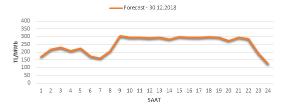 Yarından sonraki gün için oluÅŸacak ortalama piyasa takas fiyatı 249.1 TL/MWH olarak tahmin edilmektedir. Buna baÄŸlı olarak günün maksimum fiyatı 303.88 TL/MWh olarak 08:00 – 09:00 saat aralığında, minimum fiyatı 122.14 TL/MWh olarak 23:00 – Avg.:00 saat aralığında gerçekleÅŸeceÄŸi öngörülmektedir. Puant saatlerde (17:00 – 22:00) tahmini ortalama piyasa takas fiyatı ise 272.38 TL/MWh olarak hesaplanabilmektedir. Saatlik oluÅŸacak piyasa takas fiyatı tahminleri aÅŸağıdaki grafikte yer almaktadır.