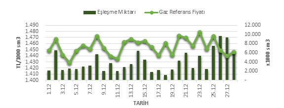 Organize Toptan Doğal Gaz Satış Piyasası (OTSP) dahilinde 01.12.2018 – 28.12.2018 tarihleri arası ortalama Gaz Referans Fiyatı (GRF) 1454.51 TL/1000 sm3 olarak belirlenirken, aynı tarihler arasında toplam gerçekleşen eşleşmelerin miktarı ise 113,424 x1000 sm3 olarak belirlendi. İlgili tarihler arasında günlük Gaz Referans Fiyatı (GRF) ile Eşleşme Miktarı verileri aşağıdaki grafikte yer almaktadır.