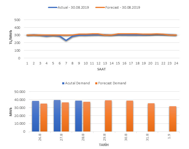 Tahminleme Modeli* analizi sonucu ortalama piyasa takas fiyatı 310.55 TL/MWh ve ortalama tüketim 38,794 MWh olarak öngörülmektedir. Modelin piyasa takas fiyatına dair başarı oranı günlük % 79, tüketime dair başarı oranı** ise günlük % 96 olarak hesaplanırken, bugüne kadar yapılan piyasa takas fiyatına dair analizlere göre başarı oranı % 91, tüketime dair başarı oranı ise % 94 olarak hesaplanmaktadır. Saatlik yarın için oluşan ve tahmin edilen piyasa takas fiyatları ile haftalık bazda tahmin edilen ve gerçekleştikçe yer alacak günlük ortalama tüketim değerleri aşağıdaki grafiklerde yer almaktadır.