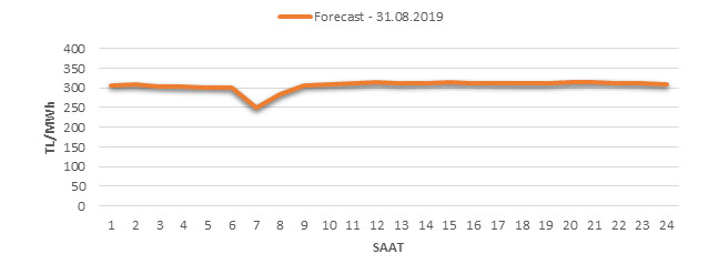 Yarından sonraki gün için oluşacak ortalama piyasa takas fiyatı 306.91 TL/MWH olarak tahmin edilmektedir. Buna bağlı olarak günün maksimum fiyatı 315.7 TL/MWh olarak 20:00 – 21:00 saat aralığında, minimum fiyatı 250.01 TL/MWh olarak 06:00 – 07:00 saat aralığında gerçekleşeceği öngörülmektedir. Puant saatlerde (17:00 – 22:00) tahmini ortalama piyasa takas fiyatı ise 313.37 TL/MWh olarak hesaplanabilmektedir. Saatlik oluşacak piyasa takas fiyatı tahminleri aşağıdaki grafikte yer almaktadır.