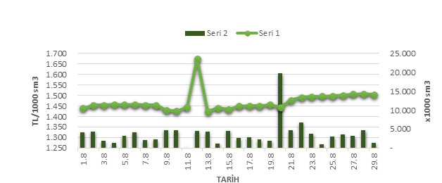 Organize Toptan Doğal Gaz Satış Piyasası (OTSP) dahilinde 01.08.2019 – 29.08.2019 tarihleri arası ortalama Gaz Referans Fiyatı (GRF) 1,469.3 TL/1000 sm3 olarak belirlenirken, aynı tarihler arasında toplam gerçekleşen eşleşmelerin miktarı ise 108,873 x1000 sm3 olarak belirlendi. İlgili tarihler arasında günlük Gaz Referans Fiyatı (GRF) ile Eşleşme Miktarı verileri aşağıdaki grafikte yer almaktadır.