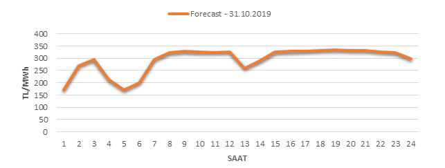 Yarından sonraki gün için oluşacak ortalama piyasa takas fiyatı 293.75 TL/MWH olarak tahmin edilmektedir. Buna bağlı olarak günün maksimum fiyatı 335 TL/MWh olarak 18:0019:00 saat aralığında, minimum fiyatı 169.99 TL/MWh olarak :0001:00 saat aralığında gerçekleşeceği öngörülmektedir. Puant saatlerde (17:0022:00) tahmini ortalama piyasa takas fiyatı ise 330.35 TL/MWh olarak hesaplanabilmektedir. Saatlik oluşacak piyasa takas fiyatı tahminleri aşağıdaki grafikte yer almaktadır.