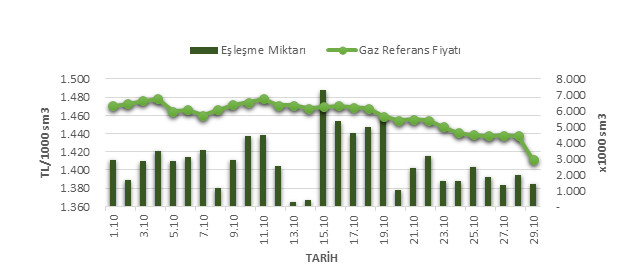 Organize Toptan Doğal Gaz Satış Piyasası (OTSP) dahilinde 01.10.201929.10.2019 tarihleri arası ortalama Gaz Referans Fiyatı (GRF) 1,460.05 TL/1000 sm3 olarak belirlenirken, aynı tarihler arasında toplam gerçekleşen eşleşmelerin miktarı ise 83,549 x1000 sm3 olarak belirlendi. İlgili tarihler arasında günlük Gaz Referans Fiyatı (GRF) ile Eşleşme Miktarı verileri aşağıdaki grafikte yer almaktadır.