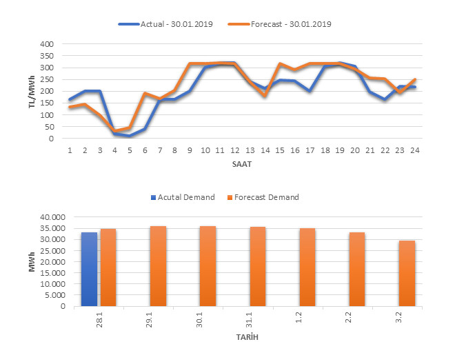 Tahminleme Modeli* analizi sonucu ortalama piyasa takas fiyatı 270.69 TL/MWh ve ortalama tüketim 35,683 MWh olarak öngörülmektedir. Modelin piyasa takas fiyatına dair başarı oranı günlük % 60, tüketime dair başarı oranı** ise günlük % 93 olarak hesaplanırken, bugüne kadar yapılan piyasa takas fiyatına dair analizlere göre başarı oranı % 88, tüketime dair başarı oranı ise % 94 olarak hesaplanmaktadır. Saatlik yarın için oluşan ve tahmin edilen piyasa takas fiyatları ile haftalık bazda tahmin edilen ve gerçekleştikçe yer alacak günlük ortalama tüketim değerleri aşağıdaki grafiklerde yer almaktadır.