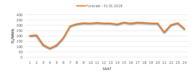 Yarından sonraki gün için oluşacak ortalama piyasa takas fiyatı 260.91 TL/MWH olarak tahmin edilmektedir. Buna bağlı olarak günün maksimum fiyatı 317.89 TL/MWh olarak 14:00 – 15:00 saat aralığında, minimum fiyatı 77.62 TL/MWh olarak 03:00 – 04:00 saat aralığında gerçekleşeceği öngörülmektedir. Puant saatlerde (17:00 – 22:00) tahmini ortalama piyasa takas fiyatı ise 294.7 TL/MWh olarak hesaplanabilmektedir. Saatlik oluşacak piyasa takas fiyatı tahminleri aşağıdaki grafikte yer almaktadır.