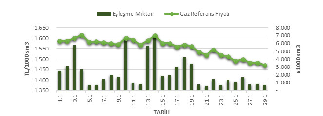 Organize Toptan Doğal Gaz Satış Piyasası (OTSP) dahilinde 01.12.2018 – 30.01.2019 tarihleri arası ortalama Gaz Referans Fiyatı (GRF) 1,552.95 TL/1000 sm3 olarak belirlenirken, aynı tarihler arasında toplam gerçekleşen eşleşmelerin miktarı ise 67,232 x1000 sm3 olarak belirlendi. İlgili tarihler arasında günlük Gaz Referans Fiyatı (GRF) ile Eşleşme Miktarı verileri aşağıdaki grafikte yer almaktadır.