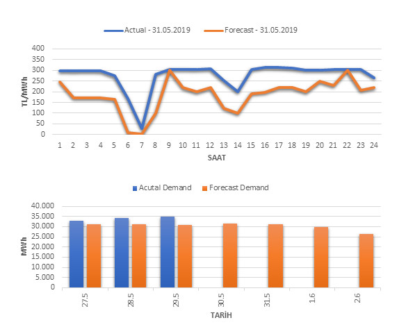 Tahminleme Modeli* analizi sonucu ortalama piyasa takas fiyatı 185.57 TL/MWh ve ortalama tüketim 31,332 MWh olarak öngörülmektedir. Modelin piyasa takas fiyatına dair başarı oranı günlük % 65, tüketime dair başarı oranı** ise günlük % 88 olarak hesaplanırken, bugüne kadar yapılan piyasa takas fiyatına dair analizlere göre başarı oranı % 88, tüketime dair başarı oranı ise % 95 olarak hesaplanmaktadır. Saatlik yarın için oluşan ve tahmin edilen piyasa takas fiyatları ile haftalık bazda tahmin edilen ve gerçekleştikçe yer alacak günlük ortalama tüketim değerleri aşağıdaki grafiklerde yer almaktadır.
