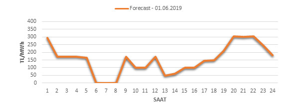 Yarından sonraki gün için oluşacak ortalama piyasa takas fiyatı 153.39 TL/MWH olarak tahmin edilmektedir. Buna bağlı olarak günün maksimum fiyatı 304.05 TL/MWh olarak 21:00 – 22:00 saat aralığında, minimum fiyatı 1 TL/MWh olarak 06:00 – 07:00 saat aralığında gerçekleşeceği öngörülmektedir. Puant saatlerde (17:00 – 22:00) tahmini ortalama piyasa takas fiyatı ise 252.16 TL/MWh olarak hesaplanabilmektedir. Saatlik oluşacak piyasa takas fiyatı tahminleri aşağıdaki grafikte yer almaktadır.