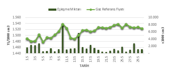 Organize Toptan Doğal Gaz Satış Piyasası (OTSP) dahilinde 01.05.2019 – 30.05.2019 tarihleri arası ortalama Gaz Referans Fiyatı (GRF) 1,512.49 TL/1000 sm3 olarak belirlenirken, aynı tarihler arasında toplam gerçekleşen eşleşmelerin miktarı ise 50,941 x1000 sm3 olarak belirlendi. İlgili tarihler arasında günlük Gaz Referans Fiyatı (GRF) ile Eşleşme Miktarı verileri aşağıdaki grafikte yer almaktadır.