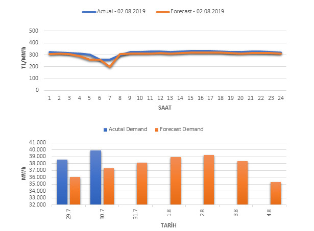 Tahminleme Modeli* analizi sonucu ortalama piyasa takas fiyatı 303.86 TL/MWh ve ortalama tüketim 39,215 MWh olarak öngörülmektedir. Modelin piyasa takas fiyatına dair başarı oranı günlük % 75, tüketime dair başarı oranı** ise günlük % 93 olarak hesaplanırken, bugüne kadar yapılan piyasa takas fiyatına dair analizlere göre başarı oranı % 91, tüketime dair başarı oranı ise % 94 olarak hesaplanmaktadır. Saatlik yarın için oluşan ve tahmin edilen piyasa takas fiyatları ile haftalık bazda tahmin edilen ve gerçekleştikçe yer alacak günlük ortalama tüketim değerleri aşağıdaki grafiklerde yer almaktadır.