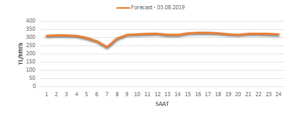 Yarından sonraki gün için oluşacak ortalama piyasa takas fiyatı 312.42 TL/MWH olarak tahmin edilmektedir. Buna bağlı olarak günün maksimum fiyatı 328.63 TL/MWh olarak 16:00 – 17:00 saat aralığında, minimum fiyatı 240 TL/MWh olarak 06:00 – 07:00 saat aralığında gerçekleşeceği öngörülmektedir. Puant saatlerde (17:00 – 22:00) tahmini ortalama piyasa takas fiyatı ise 321.9 TL/MWh olarak hesaplanabilmektedir. Saatlik oluşacak piyasa takas fiyatı tahminleri aşağıdaki grafikte yer almaktadır.