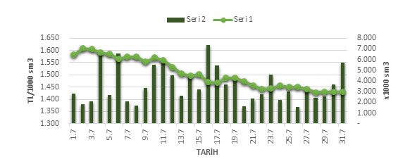Organize Toptan Doğal Gaz Satış Piyasası (OTSP) dahilinde 01.07.2019 – 01.08.2019 tarihleri arası ortalama Gaz Referans Fiyatı (GRF) 1,505.17 TL/1000 sm3 olarak belirlenirken, aynı tarihler arasında toplam gerçekleşen eşleşmelerin miktarı ise 112,329 x1000 sm3 olarak belirlendi. İlgili tarihler arasında günlük Gaz Referans Fiyatı (GRF) ile Eşleşme Miktarı verileri aşağıdaki grafikte yer almaktadır.