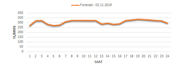 Yarından sonraki gün için oluşacak ortalama piyasa takas fiyatı 307.93 TL/MWH olarak tahmin edilmektedir. Buna bağlı olarak günün maksimum fiyatı 334.93 TL/MWh olarak 18:0019:00 saat aralığında, minimum fiyatı 269 TL/MWh olarak :0001:00 saat aralığında gerçekleşeceği öngörülmektedir. Puant saatlerde (17:0022:00) tahmini ortalama piyasa takas fiyatı ise 327.54 TL/MWh olarak hesaplanabilmektedir. Saatlik oluşacak piyasa takas fiyatı tahminleri aşağıdaki grafikte yer almaktadır.