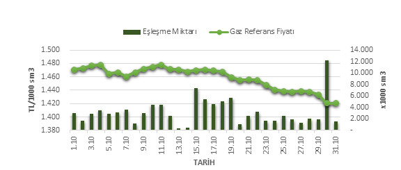 Organize Toptan Doğal Gaz Satış Piyasası (OTSP) dahilinde 01.10.201931.10.2019 tarihleri arası ortalama Gaz Referans Fiyatı (GRF) 1,458.22 TL/1000 sm3 olarak belirlenirken, aynı tarihler arasında toplam gerçekleşen eşleşmelerin miktarı ise 97,778 x1000 sm3 olarak belirlendi. İlgili tarihler arasında günlük Gaz Referans Fiyatı (GRF) ile Eşleşme Miktarı verileri aşağıdaki grafikte yer almaktadır.
