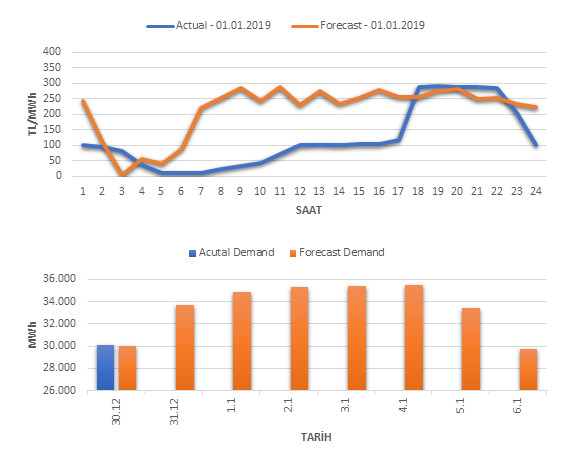Tahminleme Modeli* analizi sonucu ortalama piyasa takas fiyatı 215.3 TL/MWh ve ortalama tüketim 34,866 MWh olarak öngörülmektedir. Modelin piyasa takas fiyatına dair başarı oranı günlük % 52, tüketime dair başarı oranı** ise günlük % 100 olarak hesaplanırken, bugüne kadar yapılan piyasa takas fiyatına dair analizlere göre başarı oranı % 88, tüketime dair başarı oranı ise % 94 olarak hesaplanmaktadır. Saatlik yarın için oluşan ve tahmin edilen piyasa takas fiyatları ile haftalık bazda tahmin edilen ve gerçekleştikçe yer alacak günlük ortalama tüketim değerleri aşağıdaki grafiklerde yer almaktadır.