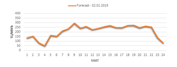 Yarından sonraki gün için oluşacak ortalama piyasa takas fiyatı 207.27 TL/MWH olarak tahmin edilmektedir. Buna bağlı olarak günün maksimum fiyatı 294.83 TL/MWh olarak 08:00 – 09:00 saat aralığında, minimum fiyatı 48.23 TL/MWh olarak 03:00 – 04:00 saat aralığında gerçekleşeceği öngörülmektedir. Puant saatlerde (17:00 – 22:00) tahmini ortalama piyasa takas fiyatı ise 240.34 TL/MWh olarak hesaplanabilmektedir. Saatlik oluşacak piyasa takas fiyatı tahminleri aşağıdaki grafikte yer almaktadır.