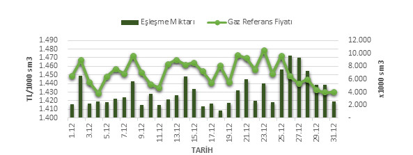 Organize Toptan Doğal Gaz Satış Piyasası (OTSP) dahilinde 01.12.2018 – 31.12.2018 tarihleri arası ortalama Gaz Referans Fiyatı (GRF) 1,452.16 TL/1000 sm3 olarak belirlenirken, aynı tarihler arasında toplam gerçekleşen eşleşmelerin miktarı ise 127,021 x1000 sm3 olarak belirlendi. İlgili tarihler arasında günlük Gaz Referans Fiyatı (GRF) ile Eşleşme Miktarı verileri aşağıdaki grafikte yer almaktadır.