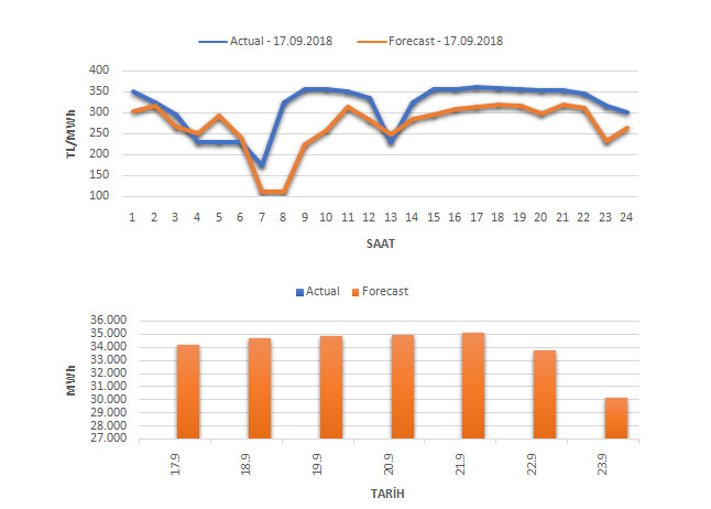 Tahminleme Modeli* analizi sonucu ortalama piyasa takas fiyatı 269,68TL/MWh ve ortalama tüketim 34.154 MWh olarak öngörülmektedir. Modelin piyasa takas fiyatına dair başarı oranı günlük% 63, tüketime dair başarı oranı isegünlük % TBD**olarak hesaplanırken, bugüne kadar yapılan piyasa takas fiyatına dair analizlere göre başarı oranı % 78,tüketime dair başarı oranı ise % 92 olarak hesaplanmaktadır. Saatlik yarın için oluşan ve tahmin edilen piyasa takas fiyatları ile haftalık bazda tahmin edilenve gerçekleştikçe yer alacakgünlük ortalama tüketimdeğerleri aşağıdaki grafiklerde yer almaktadır.