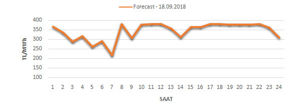 Yarından sonraki gün için oluşacak ortalama piyasa takas fiyatı 342,49TL/MWH olarak tahmin edilmektedir. Buna bağlı olarak günün maksimum fiyatı 379,78TL/MWh olarak 07:00 – 08:00saat aralığında, minimum fiyatı 215,78 TL/MWh olarak 06:00 – 07:00saat aralığında gerçekleşeceği öngörülmektedir. Puant saatlerde (17:00 – 22:00) tahmini ortalama piyasa takas fiyatı ise 375,10 TL/MWh olarak hesaplanabilmektedir.Saatlik oluşacak piyasa takas fiyatı tahminleri aşağıdaki grafikte yer almaktadır.