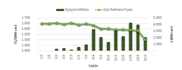 Organize Toptan Doğal Gaz Satış Piyasası (OTSP) dahilinde 01.09.2018 – 15.09.2018 tarihleri arasıortalama Gaz Referans Fiyatı (GRF)1.616,95 TL/1000 sm3olarak belirlenirken,aynı tarihler arasında toplam gerçekleşeneşleşmelerin miktarı ise 24.523 x1000 sm3olarak belirlendi. İlgili tarihler arasında günlük Gaz Referans Fiyatı (GRF) ile Eşleşme Miktarı verileri aşağıdaki grafikte yer almaktadır.