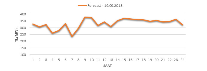 Yarından sonraki gün için oluşacak ortalama piyasa takas fiyatı 331,16 TL/MWH olarak tahmin edilmektedir. Buna bağlı olarak günün maksimum fiyatı 377,65 TL/MWh olarak 08:00 – 09:00 saat aralığında, minimum fiyatı 234,70 TL/MWh olarak 06:00 – 07:00 saat aralığında gerçekleşeceği öngörülmektedir. Puant saatlerde (17:00 – 22:00) tahmini ortalama piyasa takas fiyatı ise 351,71 TL/MWh olarak hesaplanabilmektedir. Saatlik oluşacak piyasa takas fiyatı tahminleri aşağıdaki grafikte yer almaktadır.