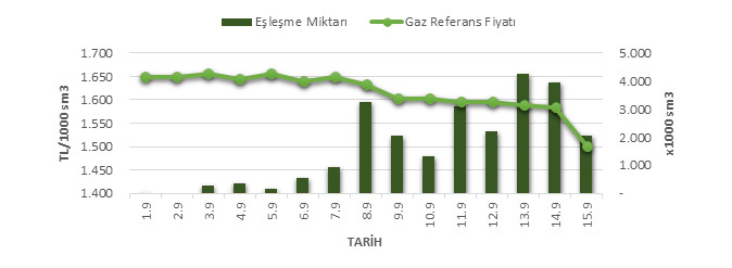 Organize Toptan Doğal Gaz Satış Piyasası (OTSP) dahilinde 01.09.2018 – 15.09.2018 tarihleri arası ortalama Gaz Referans Fiyatı (GRF) 1.616,95 TL/1000 sm3 olarak belirlenirken, aynı tarihler arasında toplam gerçekleşen eşleşmelerin miktarı ise 24.523 x1000 sm3 olarak belirlendi. İlgili tarihler arasında günlük Gaz Referans Fiyatı (GRF) ile Eşleşme Miktarı verileri aşağıdaki grafikte yer almaktadır.
