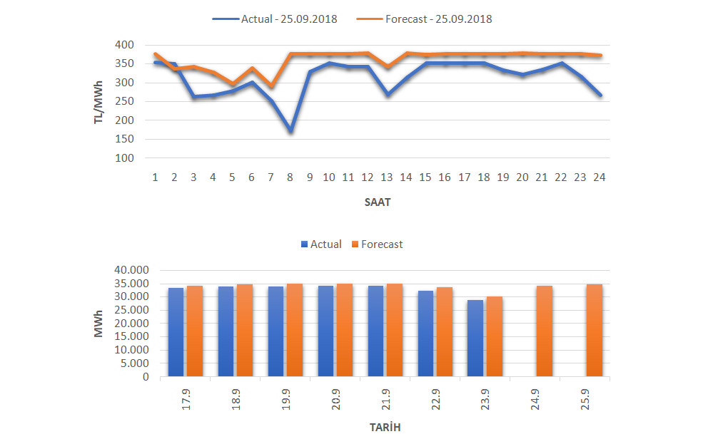 Tahminleme Modeli* analizi sonucu ortalama piyasa takas fiyatı 362,47TL/MWh ve ortalama tüketim 34.643 MWh olarak öngörülmektedir. Modelin piyasa takas fiyatına dair başarı oranı günlük% 65, tüketime dair başarı oranı isegünlük % 95olarak hesaplanırken, bugüne kadar yapılan piyasa takas fiyatına dair analizlere göre başarı oranı % 78,tüketime dair başarı oranı ise % 92 olarak hesaplanmaktadır. Saatlik yarın için oluşan ve tahmin edilen piyasa takas fiyatları ile haftalık bazda tahmin edilenve gerçekleştikçe yer alacakgünlük ortalama tüketimdeğerleri aşağıdaki grafiklerde yer almaktadır.
