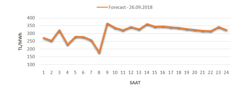 Yarından sonraki gün için oluşacak ortalama piyasa takas fiyatı 310,98TL/MWH olarak tahmin edilmektedir. Buna bağlı olarak günün maksimum fiyatı 366,46TL/MWh olarak 08:00 – 09:00saat aralığında, minimum fiyatı 178,85TL/MWh olarak 07:00 – 08:00saat aralığında gerçekleşeceği öngörülmektedir. Puant saatlerde (17:00 – 22:00) tahmini ortalama piyasa takas fiyatı ise 328,38 TL/MWh olarak hesaplanabilmektedir.Saatlik oluşacak piyasa takas fiyatı tahminleri aşağıdaki grafikte yer almaktadır.