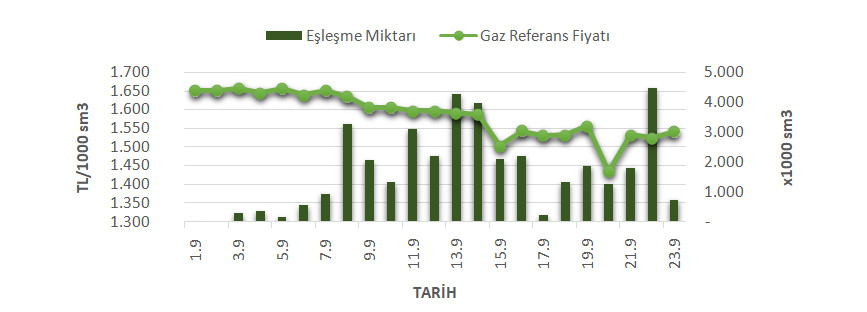 Organize Toptan Doğal Gaz Satış Piyasası (OTSP) dahilinde 01.09.2018 – 23.09.2018 tarihleri arasıortalama Gaz Referans Fiyatı (GRF)1.584,64 TL/1000 sm3olarak belirlenirken,aynı tarihler arasında toplam gerçekleşeneşleşmelerin miktarı ise 38.411 x1000 sm3olarak belirlendi. İlgili tarihler arasında günlük Gaz Referans Fiyatı (GRF) ile Eşleşme Miktarı verileri aşağıdaki grafikte yer almaktadır.
